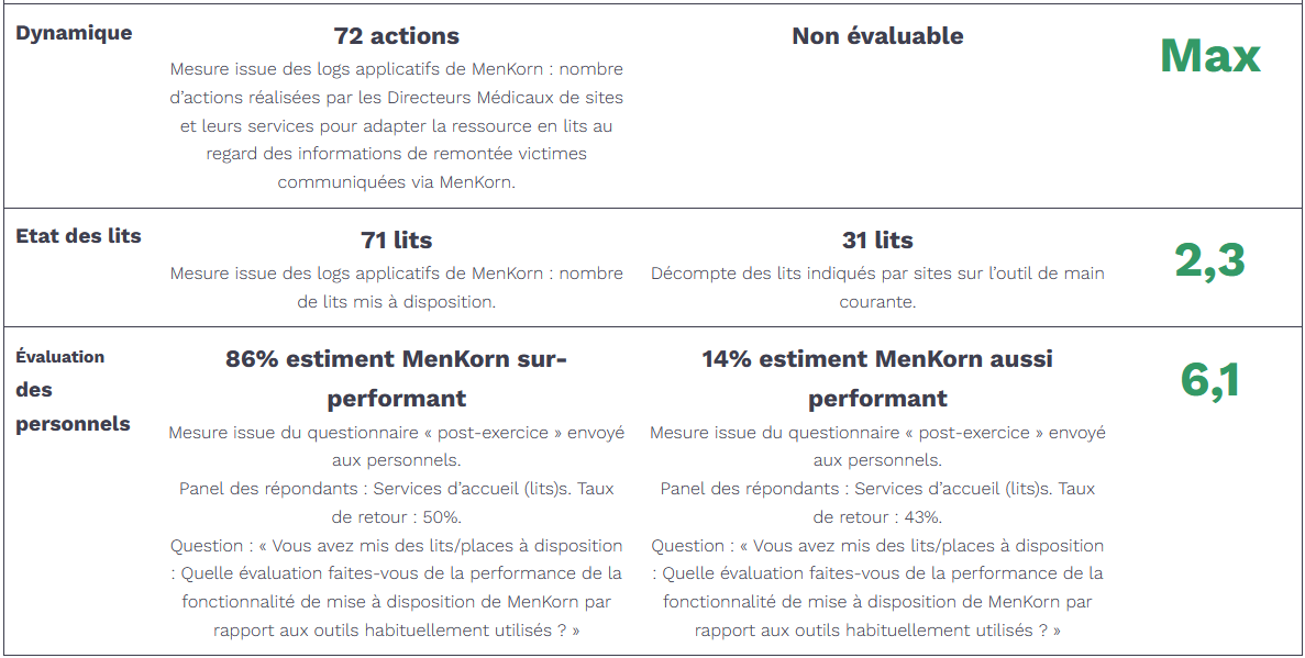 L’objectif principal était d’évaluer la performance d’une solution numérique : MenKorn NOVI par rapport aux outils habituels de gestion de crise utilisés en salle de crise du SAMU, sur le terrain, au sein des salles de crise de sites et dans diverses instances (COD, CCH).