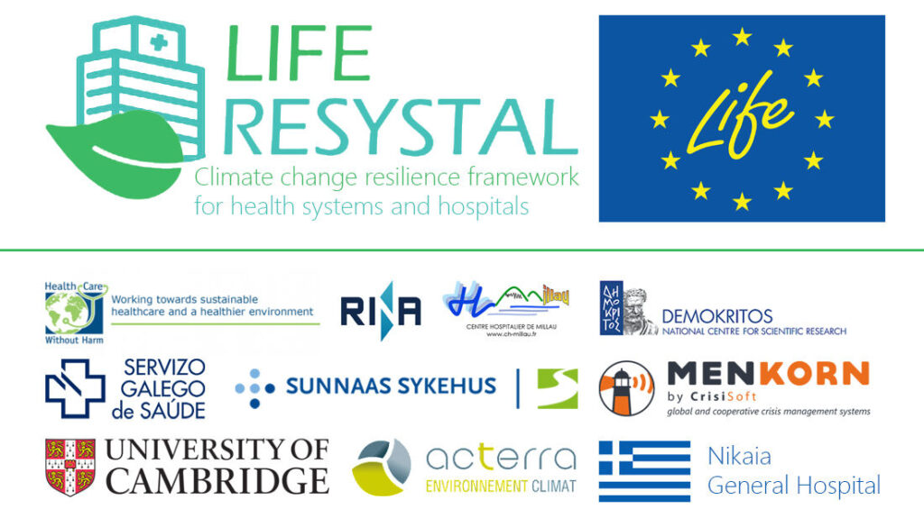 A l’été 2020, un consortium se constitue pour élaborer un projet visant à renforcer la résilience des systèmes de santé dans le cadre du changement climatique, à travers l’Europe. Ce consortium rassemble l’Université de Cambridge, le centre national de recherche scientifique grec “Demokritos”, le réseau Health Care Without Harm Europe, l’hôpital général de Nikaia en Grèce, le centre hospitalier de Millau Sainte Afrique, le service de santé de Galice en Espagne, l’hôpital Sunnaas en Norvège, les cabinets spécialisé en climat Rina en Italie et Acterra en France et CrisiSoft gestion de crise.